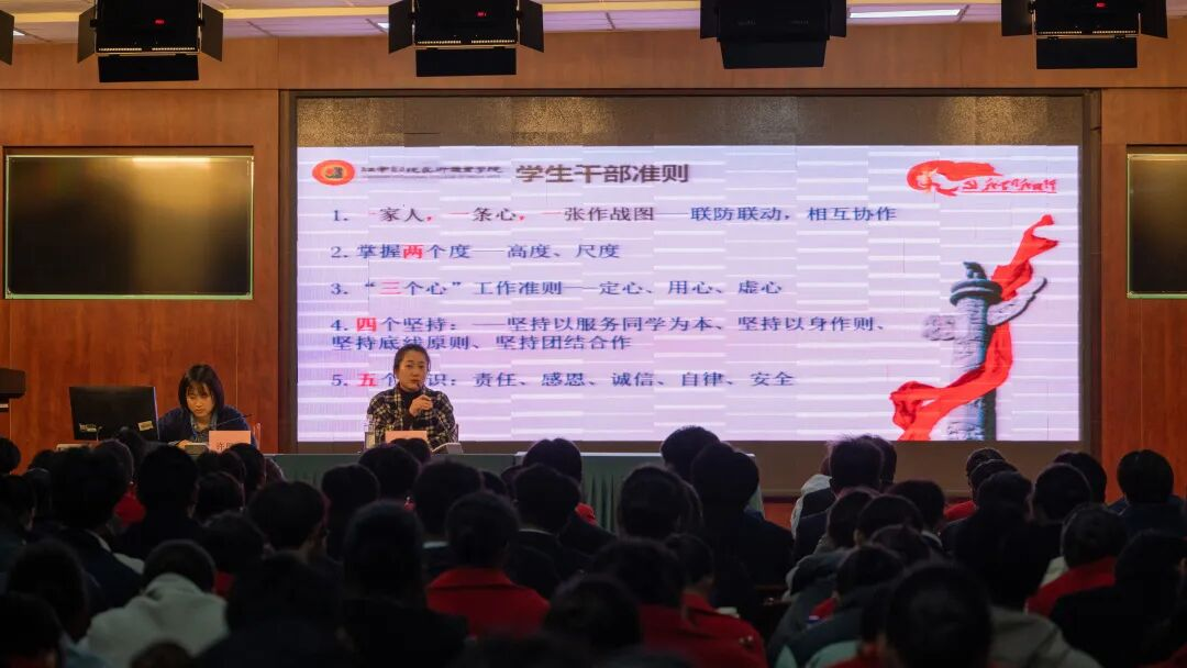 杨丽璇院长结合“江影精神”,为学生干部们解读了《学生干部准则》——从“一家人、一条心、一张作战图”的联动协作,到“高度、尺度”的自我要求,再到“定心、用心、虚心”的工作准则,每一项都为学生干部们明晰了成长方向;“四个坚持”与“五个识”的提出,更是为大家注入了“责任、感恩、诚信、自律、安全”的行动标尺。