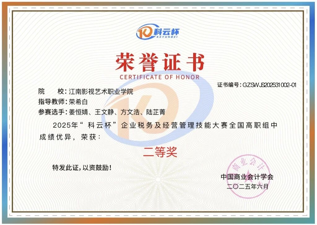 近日, 由中国商业会计学会主办的2025年“科云杯”企业税务及经营管理技能大赛获奖名单公布,江南影视艺术职业学院姜恒婧、王文静、方文浩、陆芷菁,周洁丽、谢其玲、方颖、彭欣琪8位同学组成2支代表队均获得高职组二等奖!