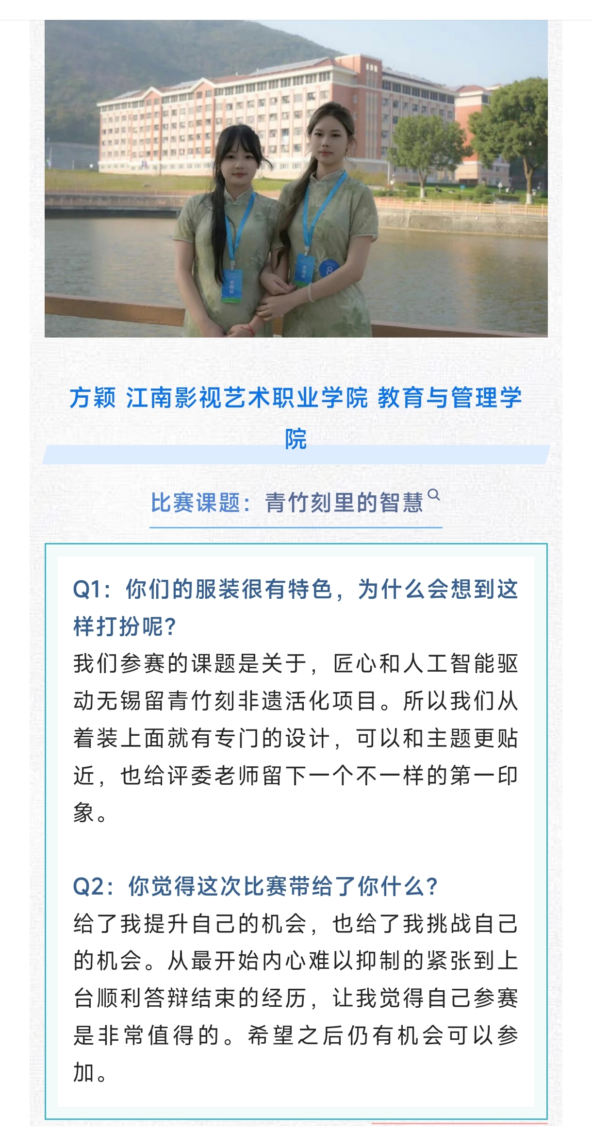 此次在无锡市三创赛上的精彩表现,不仅为学校和学院赢得了荣誉,更向社会展示了当代青年大学生在文化传承与科技创新领域的担当与作为。未来,教育与管理学院将继续支持和引导学生投身于此类富有社会价值的创新实践中,为培养新时代所需的复合型、创新型人才而不懈努力。