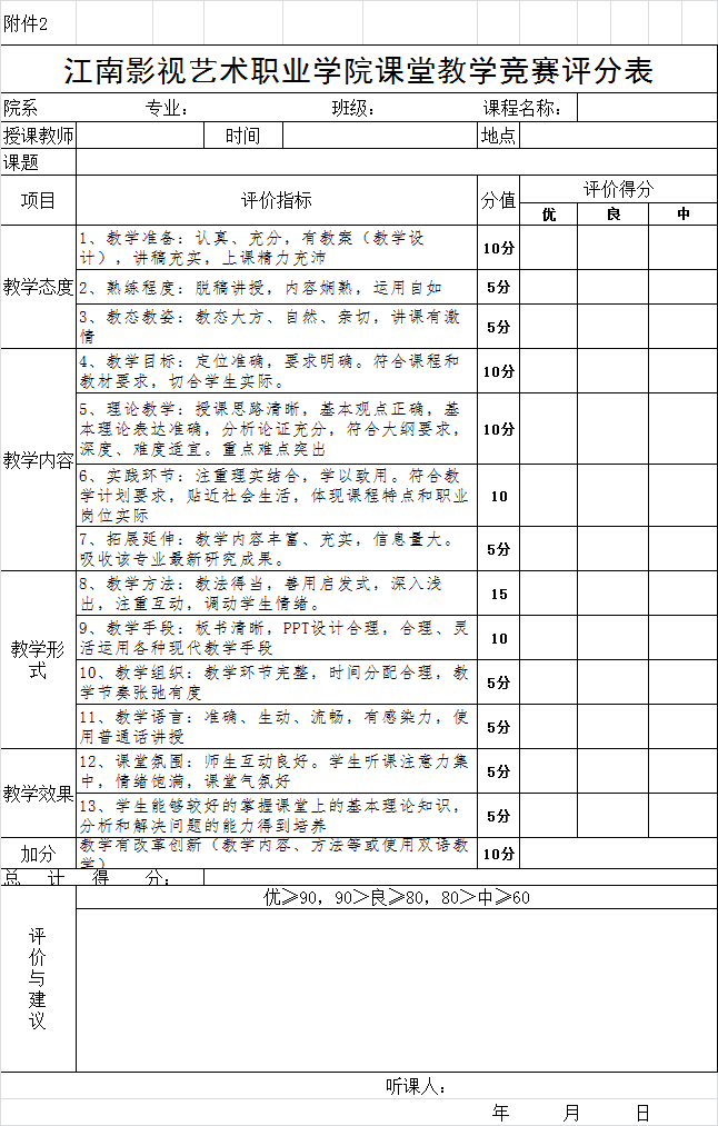 《江南影视艺术职业学院教师课堂竞赛评分表》