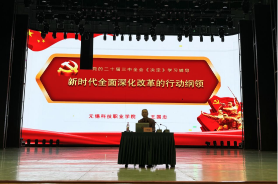 2024年10月23日,无锡科技职业学院党委副书记王国忠莅临我校,在彩虹剧院开展了第二期思政讲座,讲座主题——“新时代全面深化改革的行动纲领”。王国忠书记从“关注焦点——举旗定向与谋篇布局”、“内容体系——全面深化与政策举措”、“贯彻重点——五个维度与落实要求”三个部分,为江影师生详细解读了党的二十届三中全会《决定》主要精神。