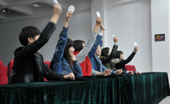 初赛以小组淘汰的形式开展,共分为五组,在主持人念完题后抢答,小组中正确答题最多的优胜者再和其他组的优胜者比赛,由此选拔出最终优胜者。热身题过后,紧张的比赛开始了,同学们专心听题,认真思索,努力抢答,场面异常热烈。