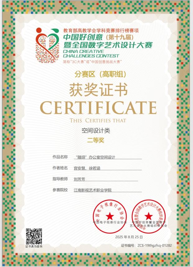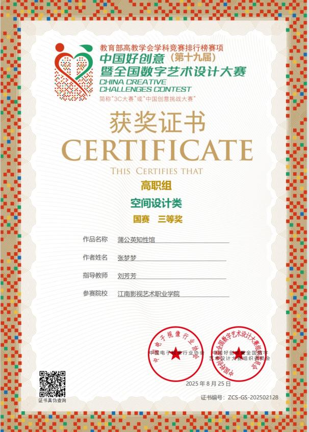 经过师生团队的共同努力,我们提交的作品在全国众多参赛院校中脱颖而出,最终荣获全国总决赛三等奖一项,并在省级选拔赛中荣获省级二等奖一项。这两项荣誉充分展现了我院学生在空间创意、设计表现与综合实践能力上的水平。