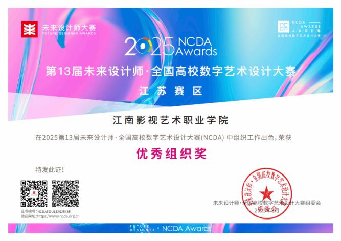 在2025第13届未来设计师全国高校数字艺术设计大赛中,我院共获得国赛奖项4项,优秀指导老师7人;省级赛奖项20项,优秀指导教师14人。学校凭借突出成绩荣获江苏赛区优秀组织奖,我院贾曚院长获江苏赛区优秀组织教师。