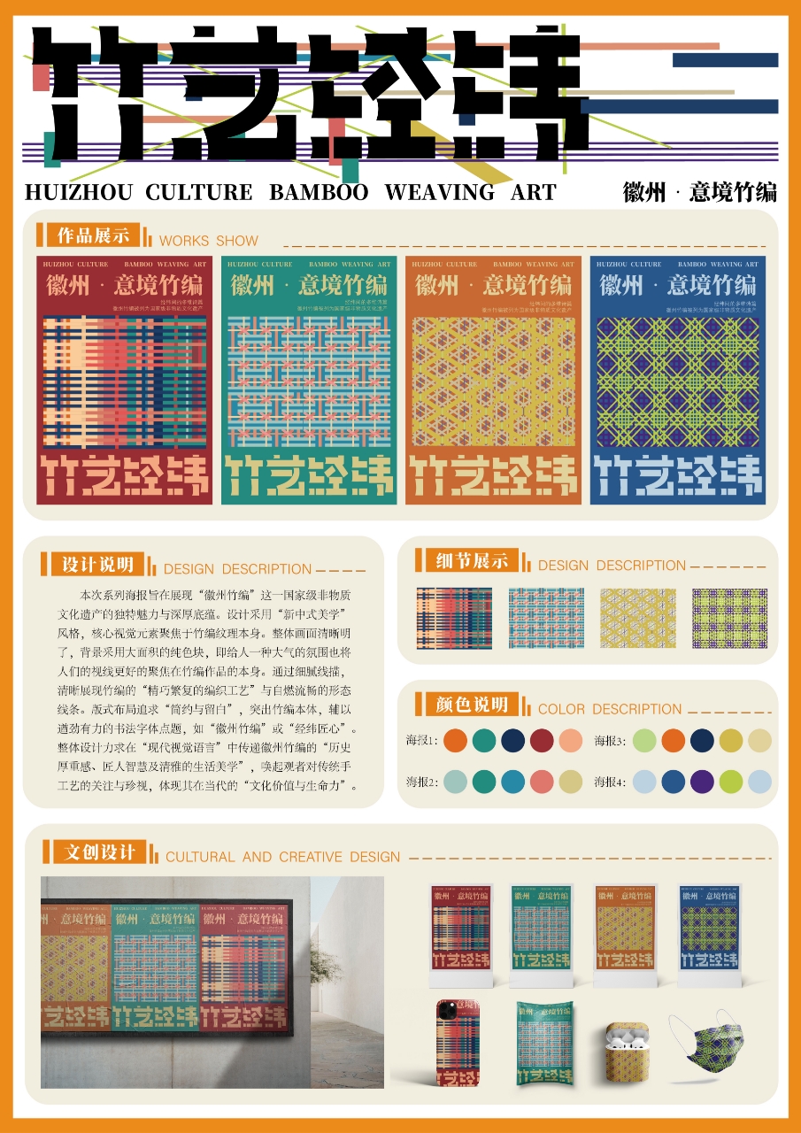 徐诗雨同学的获奖作品《竹艺经纬》,深度融合传统竹艺元素与现代设计语言,既彰显了对传统文化的传承与敬畏,又展现了青年设计师独特的创新视角与实践能力。作品在创意构思、表现形式与实用价值上均获得评审专家的高度认可,成为江苏省赛区的优秀代表之一。