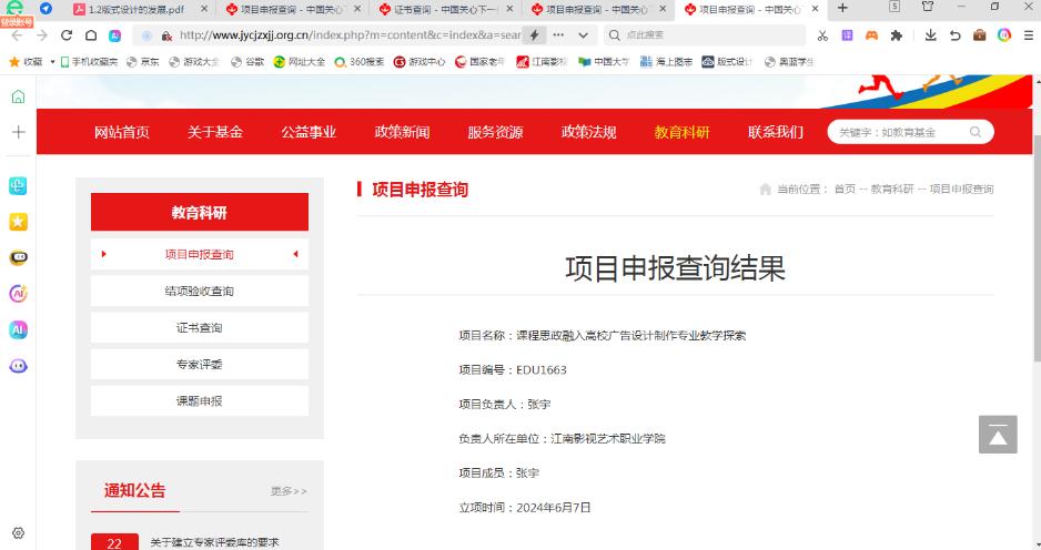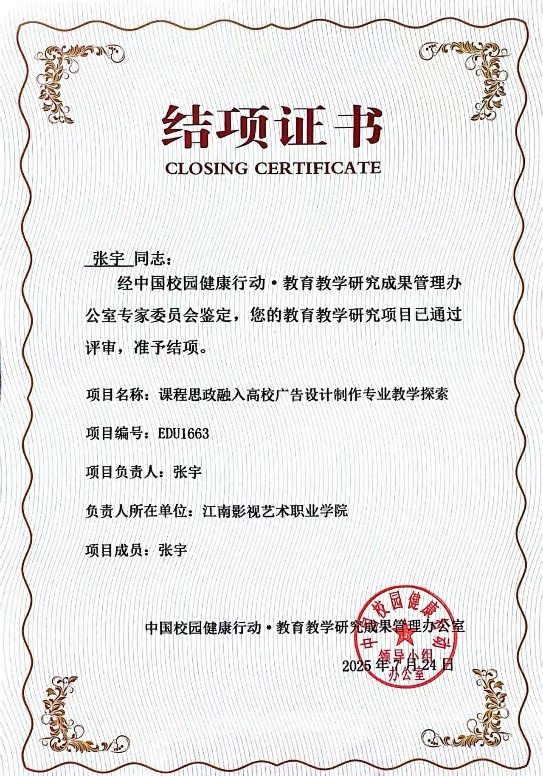 该项目于2024年成功获批立项,自立项以来,张宇老师带领课题组成员严格遵照中国关心下一代健康体育基金会相关管理办法,聚焦高校广告设计制作专业教学中的思政育人痛点,系统开展教学模式创新、课程体系重构、实践路径探索等系列研究工作。课题组通过文献梳理、课堂实践、案例分析、效果评估等多种研究方法,深入挖掘广告设计专业与思政教育的契合点,构建了 “思政引领、专业赋能、实践育人” 三位一体的教学体系,为高校艺术类专业落实 “立德树人” 根本任务提供了可借鉴的实践样本。