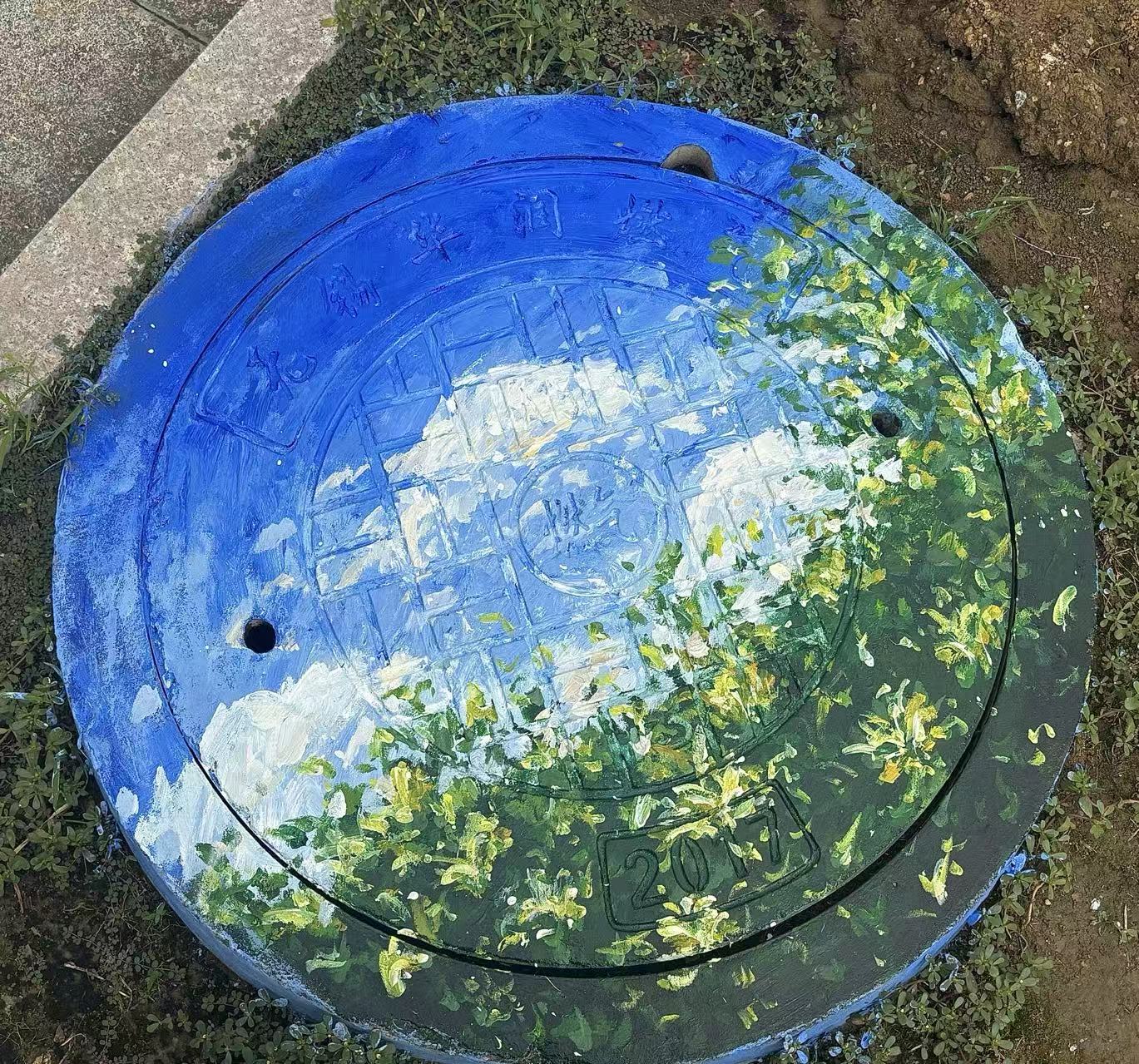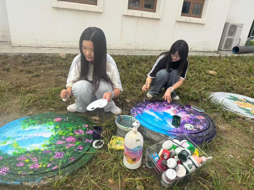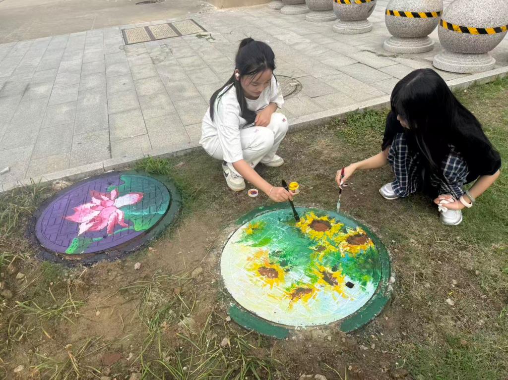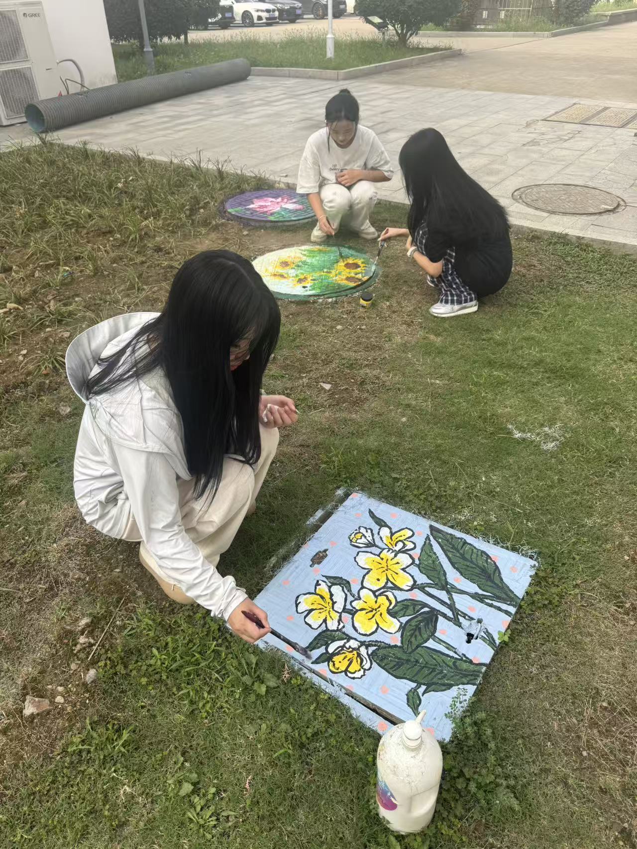 此次活动以“美化校园景观,传递艺术温度”为目标,师生们共完成10个井盖的创意绘画。创作灵感源于自然风景与民俗元素,同学们拿起画笔,用明快撞色勾勒出活泼图案,充满青春活力。原本单调的井盖,在师生们的巧手下,变成了一个个小巧精致的“地面艺术品”。
