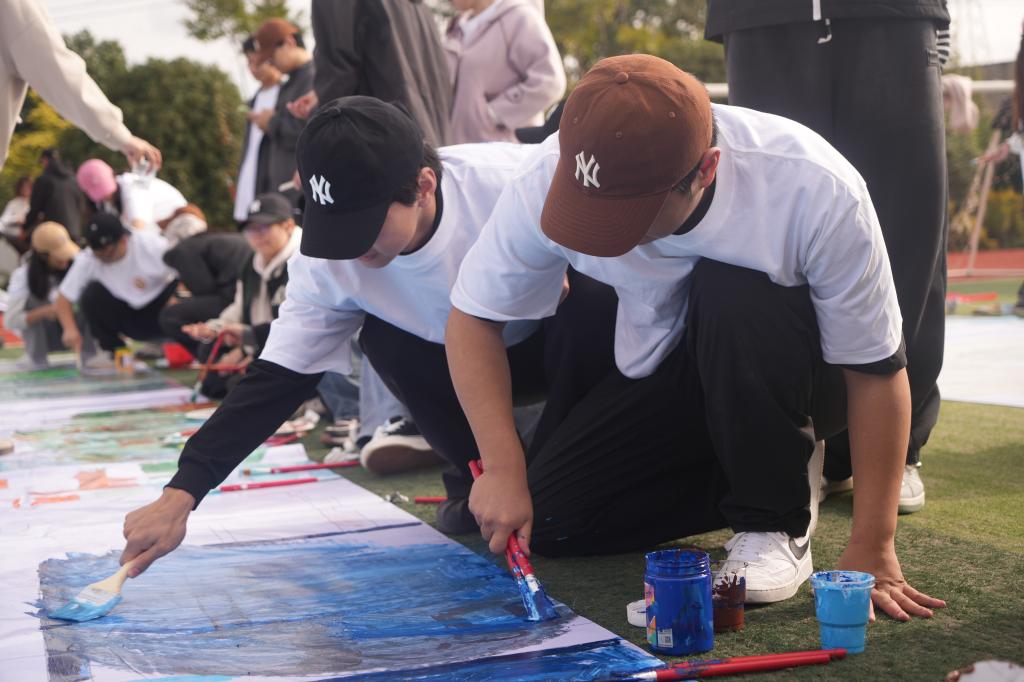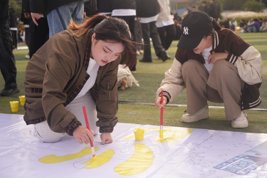活动现场精彩纷呈,“共绘校园美景”、“众星捧月”、“运转乾坤球”、“萌趣毛毛虫”、“动力绳圈”等多个趣味项目接连上演。其中,“共绘校园美景”环节成为全场焦点——同学们将设计专业的审美素养与创意灵感融入画笔,分工协作、巧妙构思,一笔一画勾勒出对学校的热爱与对未来的憧憬,用专业实力为团队荣誉添彩。