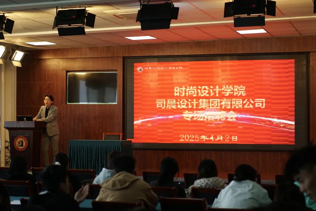 为促进校企合作,给学生提供更多就业机会,2025年4月3日,司晨设计集团有限公司走进江南影视艺术职业学院时尚设计学院,在德艺楼五楼会议室成功召开了专场招聘宣讲。此次招聘宣讲为学生与企业搭建了面对面沟通的桥梁,在校园内掀起了一股求职热潮。