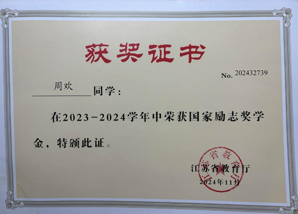 7.2024年11月 在2023年-2024学年中荣获国家励志奖学金。