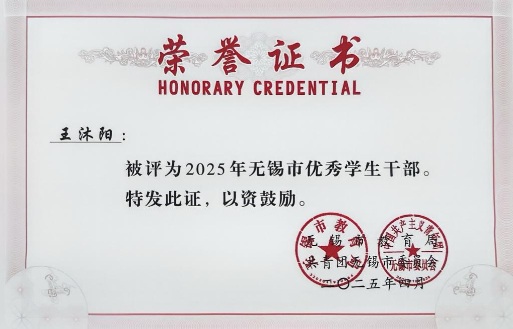 王沐阳同学以出色的专业素养、卓越的组织能力和无私的奉献精神,生动诠释了新时代学生干部的优秀品质。作为环境艺术设计专业的学生骨干,他不仅在本职岗位上表现突出,更在服务同学、回馈社会方面做出了积极贡献。相信他将继续保持优良作风,以艺术设计专业特长服务无锡城市建设,在更广阔的舞台上展现无锡学子的青春风采!