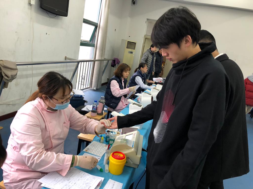 正式抽血前,为确保每位同学的身体状况适合献血,医生为参与献血的学生进行基本的体检。